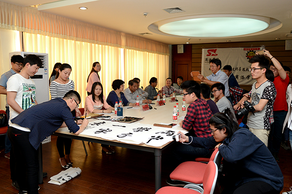 我校书画协会还向南开科技大学两岸文化交流研习团师生赠送了现场创作的“两岸学子一家亲”“富贵牡丹”等书画作品,以作纪念。