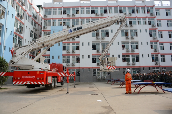 演练活动以我校11号男生公寓楼起火为预设背景。随着指挥员一声令下,同学们用湿毛巾捂住口鼻,从“失火”的楼道中奔出。在逃离过程中,大家严格听从引导,几分钟后全体参演的同学安全撤离火灾现场。消防支队的官兵也在第一时间赶到现场,云梯车、水龙车依次展开,迅速对失火楼层进行扑救。就在这时,从五楼一扇窗口中探出两个身影,这是两位模拟被困屋内的同学在挥舞毛巾大声呼救。消防队员迅速架起云梯车,几分钟后这两位同学被安全“救出”。