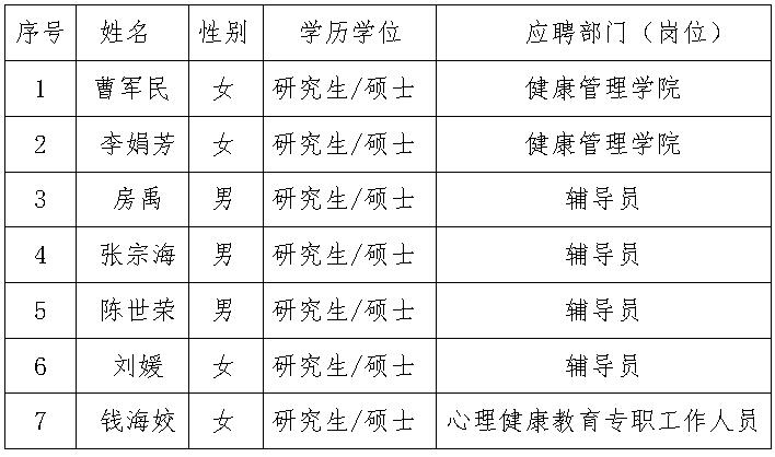 根据陕西省人社厅《关于陕西省事业单位公开招聘人员办法》规定及《商洛学院2019年人才招聘计划》,经过资格审查、试讲(笔试)、专家面试等环节考察,并经院长办公会2019年3月28日研究,同意招聘曹军民等7位同志来我校工作,现予以公示。如有异议,请于2019年4月1日前向人事处或监察室反映。