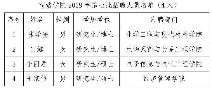 根据陕西省人社厅《关于陕西省事业单位公开招聘人员办法》规定及《商洛学院2019年人才招聘计划》,经过资格审查、试讲、专家面试等环节考察,并经院长办公会2019年5月14日研究,同意招聘张学亮等4位同志来我校工作,现予以公示。如有异议,请于2019年5月20日前向人事处或监察室反映。