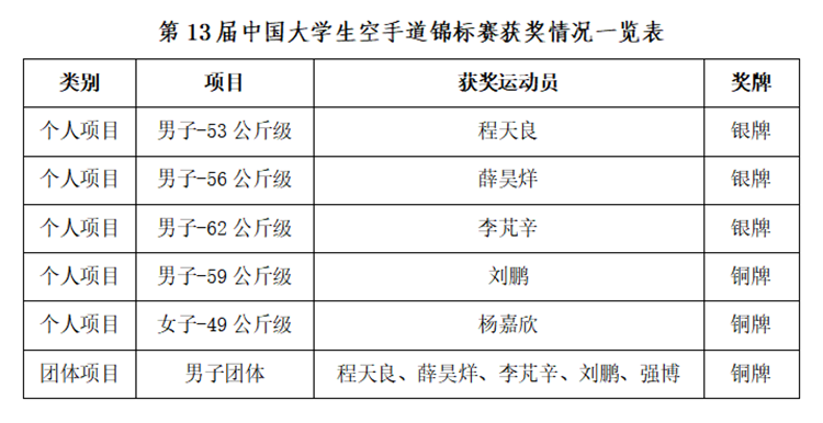 近日,在浙江省温州市永嘉县举行的第13届中国大学生空手道锦标赛上,我校空手道代表队奋勇拼搏、发挥出色,共获得3枚银牌、2枚铜牌及男子团体铜牌。队员范思宇荣获“优秀运动员”称号,体育教学研究部教师桑国鹏获评“优秀教练员”。