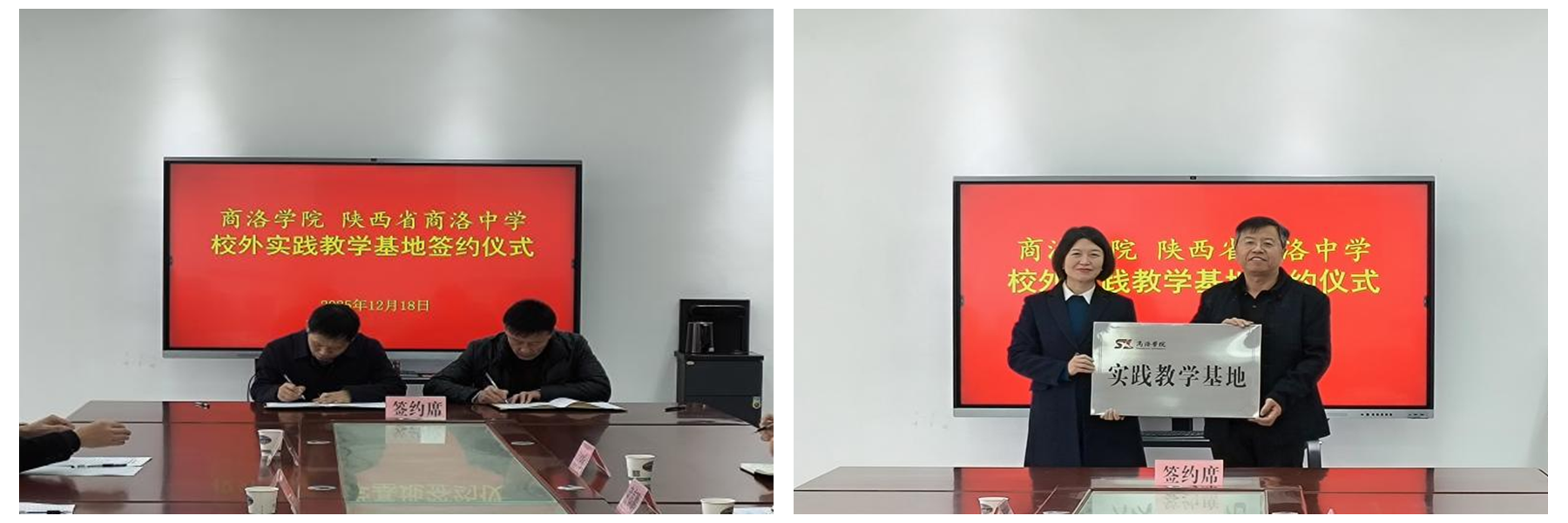 当天上午,“商洛学院与陕西省商洛中学校外实践教学基地”签约暨授牌仪式在商洛中学举行。商洛中学教务处主任刘丹军与商洛学院人文学院院长张文诺共同签署合作协议。商洛学院教务处处长王怡与商洛中学副校长武高鹏为基地揭牌,并向商洛中学赠送教育教学类书籍。