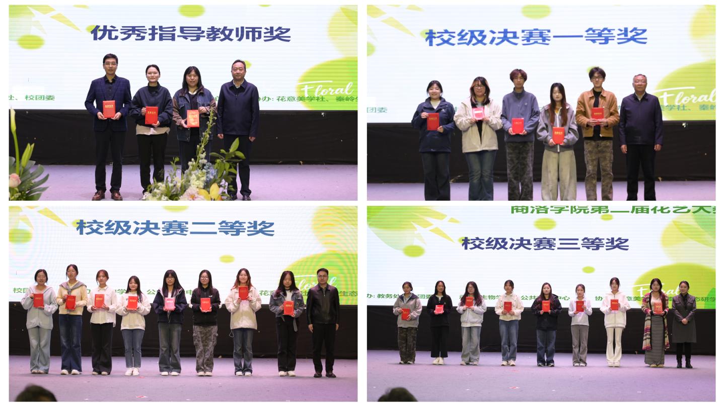 大赛特邀陕西省花艺大赛评委专家、西北农林科技大学风景园林艺术学院副教授赵冰等校内外专家组成评审团,从创新立意、构图布局、色彩搭配、技术完成度、作品精细度等多个维度对参赛作品进行综合评审。最终,生物学院园林专业杨昕萌的插花作品《清韵栖春-静待一隅清欢》,艺术学院音乐学专业学生邢静蕊的插花作品《笼中花事》、美术学专业学生李好肄的盆栽作品《莲湖春光》、美术学专业学生张佳乐的押花作品《盛放》、音乐学专业学生杨易鑫的盆栽作品《石上幽居》获得大赛一等奖。教育科学学院学前专业学生陈思羽、生物学院园林专业学生赵华华等完成的10个作品获得大赛二等奖。生物学院生技专业学生周雨涵等完成的15个作品获得大赛三等奖。生物学院刘长命、韩欢欢,艺术学院张玉英、杜璐,教育科学学院杨姗姗等教师获评优秀指导教师。