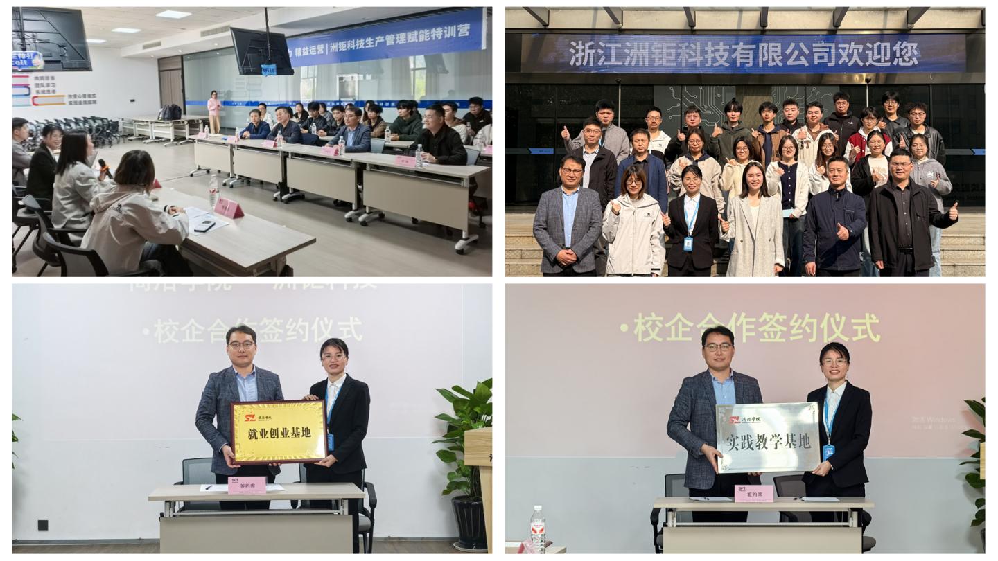 在浙江洲钜科技有限公司,校企双方就研究生联合培养、实践教学、学生实习就业等方面进行了深入的探讨并达成合作,刘征文与浙江洲钜科技有限公司人力资源部部长·工会主席朱一帆作为校企双方代表完成签约及授牌。
