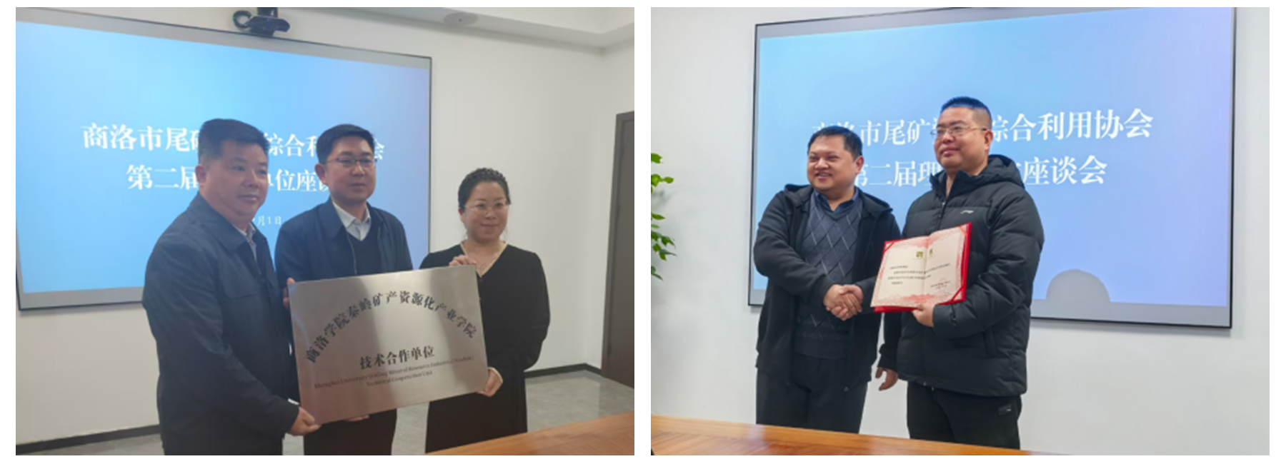 会上,学院与尾矿资源综合利用协会签署战略合作协议,明确将依托陕西省尾矿资源综合利用重点实验室、秦岭矿产资源化产业学院等科研平台,为会员单位提供技术支撑与人才保障。曹宝月代表学院向市尾矿资源综合利用协会授予“商洛学院秦岭矿产资源化产业学院技术合作单位”铭牌,周春生、刘明宝、李峰等专家受聘为市尾矿资源综合利用协会名誉技术顾问。曹宝月还重点介绍了学院在尾矿有价金属高效提取、尾矿基新型建材开发及尾矿库生态修复等领域的科研成果。