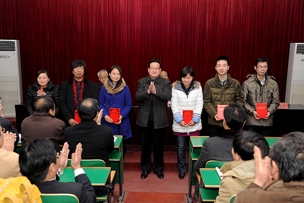 在热烈的掌声中,刘建林、王思怀、陈永庄、魏书堂分别为2013年度校级优秀教案及优秀电子课件获奖者、优秀实习带队教师、教学技能竞赛优胜者、校级教学成果奖获得者、校级本科教学工程精品课程和双语教学示范课负责人、校级教学名师、省级科学成果二等奖获得者颁奖;为省级本科教学工程项目授牌。副院长魏书堂宣读了表彰决定。