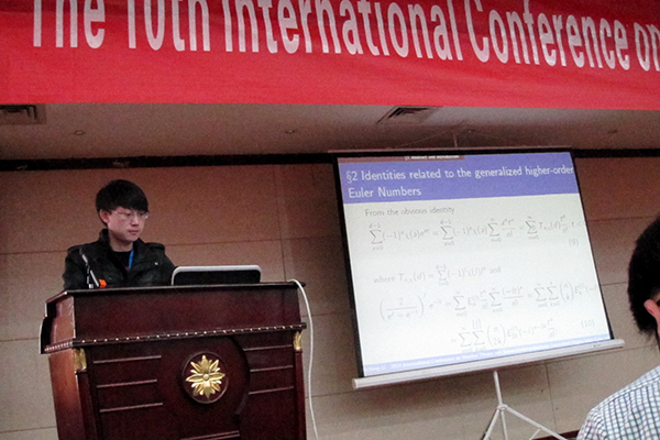 李育丞在本届研讨会上作了题为《Some identities involving Generalized Higher-order Euler and Bernoulli Numbers》的学术交流报告。在报告中,李育丞应用绝对收敛幂级数的柯西乘积公式,给出了推广的高阶Euler数和高阶Bernoulli数的组合表达式。与会专家对李育丞的报告内容、大方自然的表现及英语口语给予了好评。