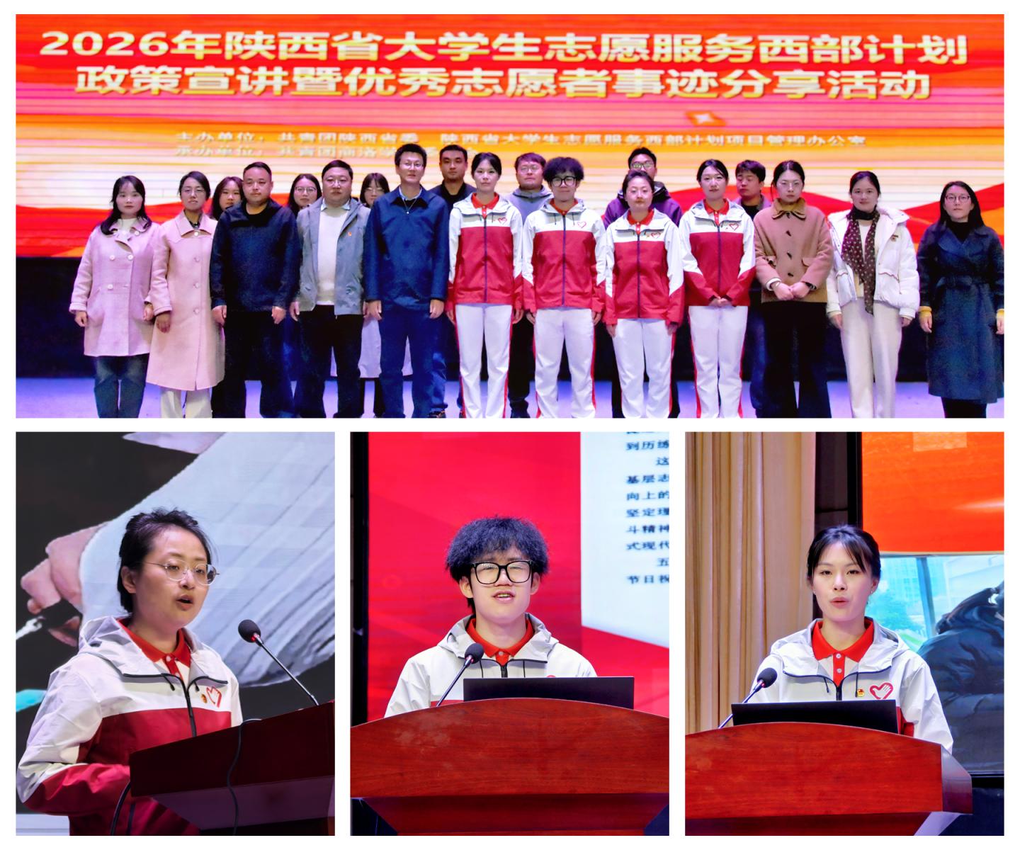 为深入落实大学生志愿服务西部计划工作要求,引导广大青年学生把个人理想融入国家发展大局,积极投身基层、服务西部建设,3 月 26 日下午,团省委在我校大学生活动中心举办2026年陕西省大学生志愿服务西部计划政策宣讲暨优秀志愿者事迹分享会。团省委青社部干部郑楠、团市委副书记周遊、商洛职业技术学院团委副书记杨斌及陕西省西部计划宣讲团成员出席活动。我校学生处、团委相关工作人员、各二级学院团总支书记及学生代表参加活动。活动由校团委副书记巩俊龙主持。