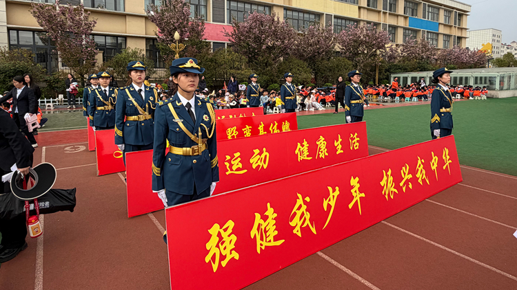 当日上午,在附属小学操场举行的运动会开幕式上,国旗护卫队队员身着礼宾服,肩扛五星红旗,步调铿锵有力,从操场一侧庄严护送国旗入场。随着指挥员口令下达,现场奏响《义勇军进行曲》,五星红旗冉冉升起,全场师生行注目礼。升旗仪式结束后,国旗护卫队队员与部分小学生进行了现场互动,队员就礼宾服配饰、队列口令等内容解答学生提问,并指导少先队礼的规范动作。